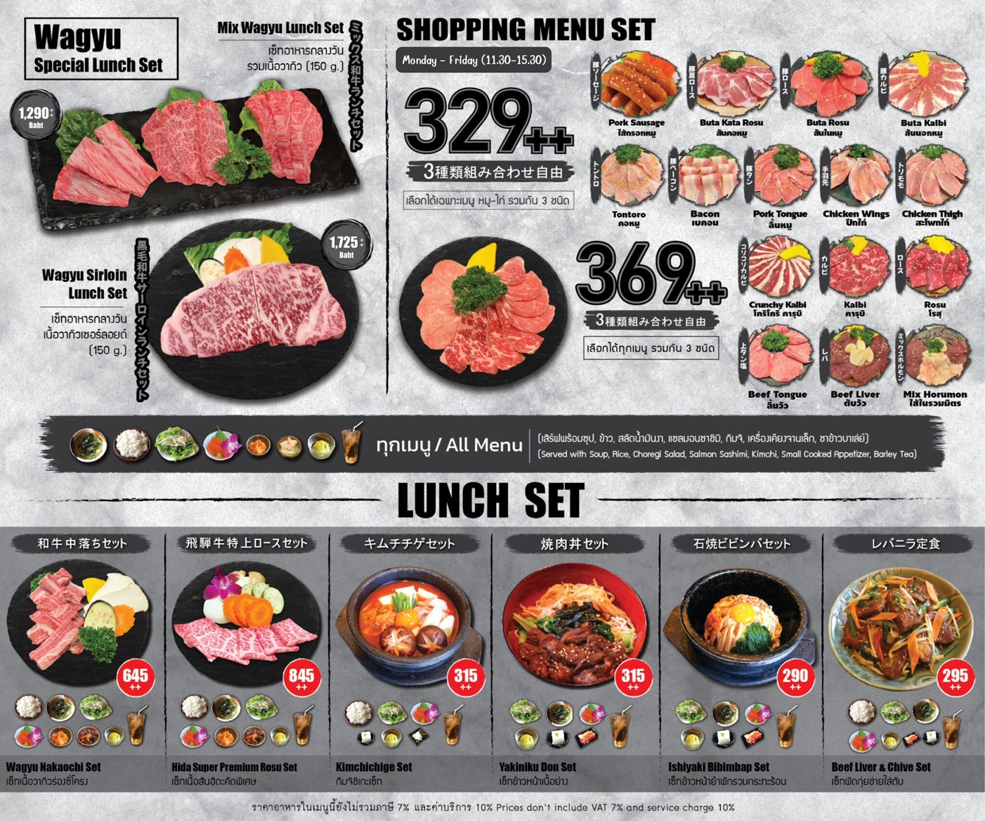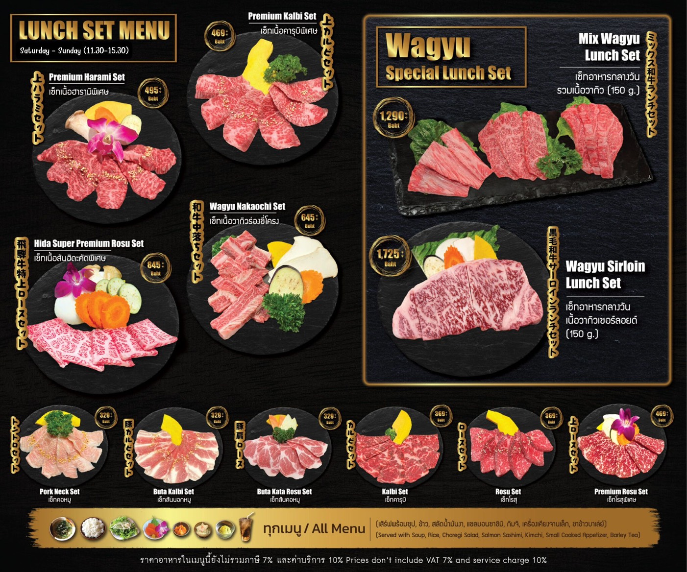 Promotion Wagyu Lunch Set Lunch Set Mon.-Fri. 11:30-15:30 Lunch Set Sat.-Sun. 11:30-15:30 Buy 1 Get 1 Free *หมายเหตุ เมนูอาจมีการเปลี่ยนแปลง โดยไม่ได้แจ้งให้ทราบล่วงหน้า